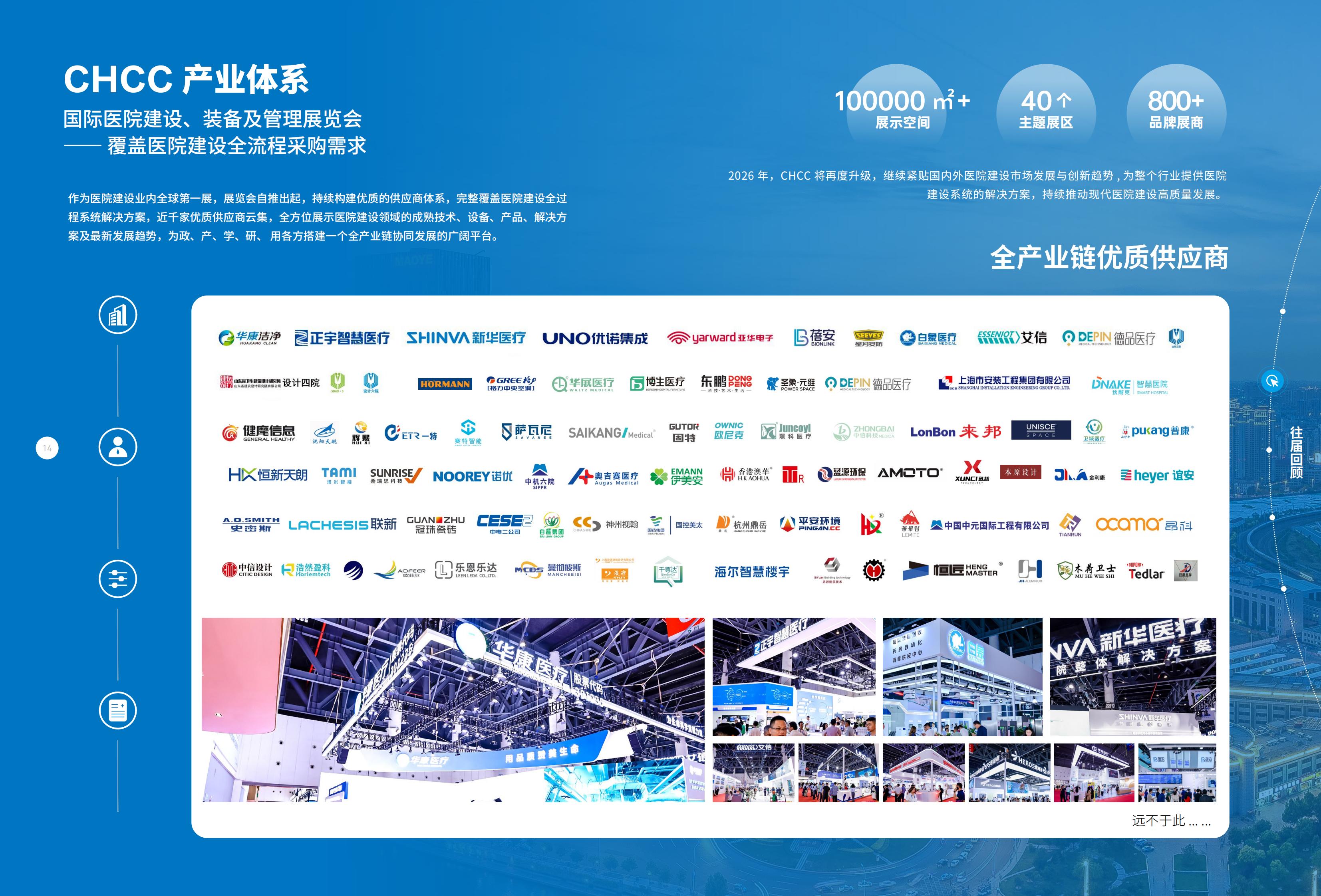 CHCC2026 紧跟新时代发展趋势,把握现代医院发展新需求,设置“推动创新科技广泛应用,建造医疗空间具身智能体”与“推动中国医院建设产业出海”双主题,与“第十届中国智慧医院大会”“第九届医学工程发展创新大会”“第八届全国医养结合机构建设发展大会”“第四届中国医院学科发展大会”“第二届全国医院后勤创新发展大会”“第二届中国医用机器人应用大会”七会同行,规划100+专题论坛,邀请1000+行业专家知识分享,预计吸引1万+参会代表莅临;10万㎡展示空间,设置8大主题展馆,40大展区,800+供应商入驻,预计吸引全球6万+专业观众、150+参观团到场,共赴行业盛会。